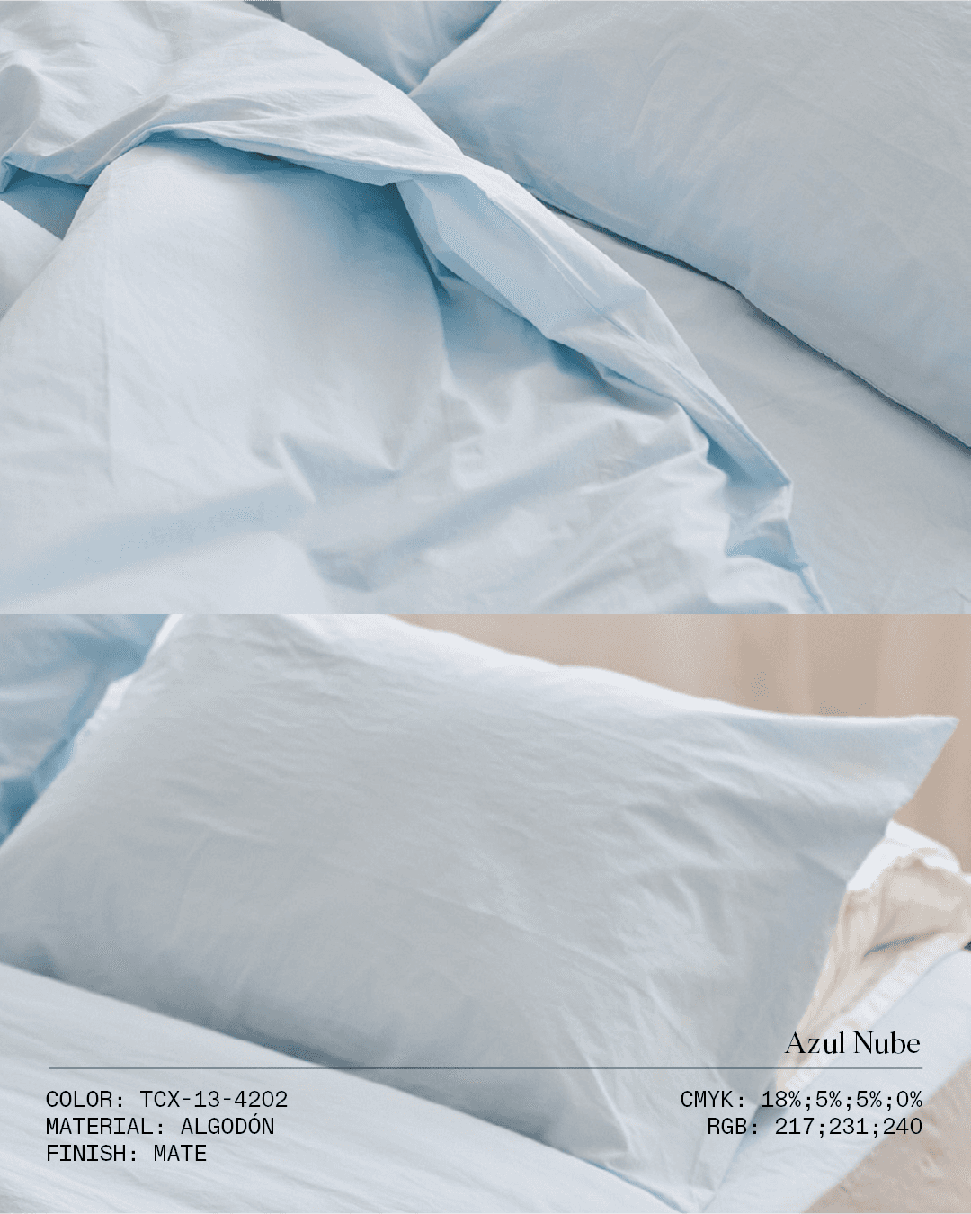 Azul Nube es suave, casi blanco, que se siente ligero, fresco y pensado para la desconexión que todos buscamos al meternos a la cama.