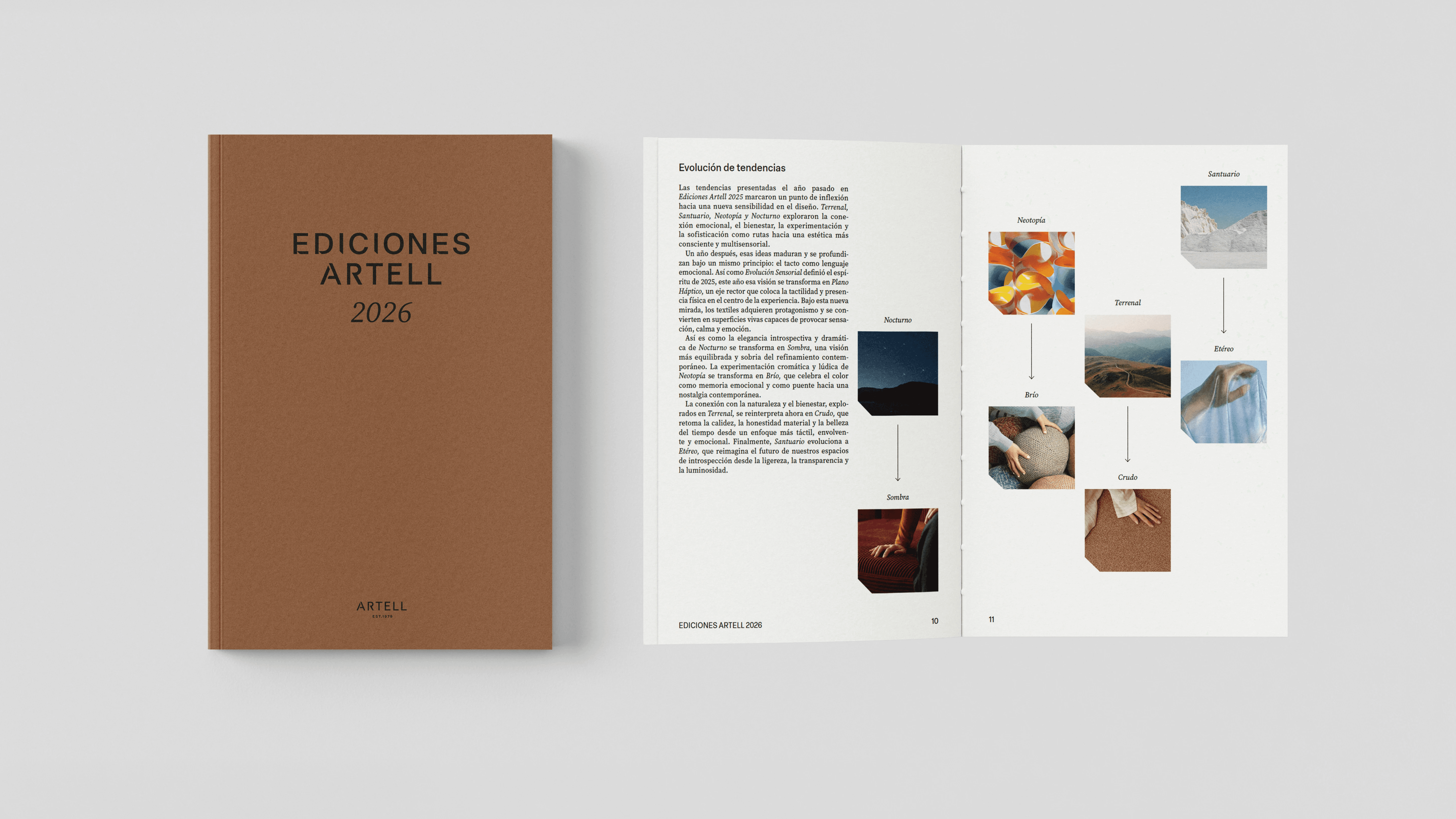Por segundo año, desarrollamos el programa de tendencias Ediciones Artell 2026. Para esta edición, investigamos una serie de cuatro tendencias (Sombra, Brío, Crudo y Etéreo) donde cada historia captura los colores, materiales, texturas y patrones que guiarán el diseño de espacios duarnte el 2026. Bajo el eje rector "Plano Háptico", reivindicamos el poder del contacto, donde artesanía y tecnología coexisten en equilibrio para dar vida a textiles que se sienten vivos y que transforman los espacios desde la experiencia sensorial más esencial: sentir.